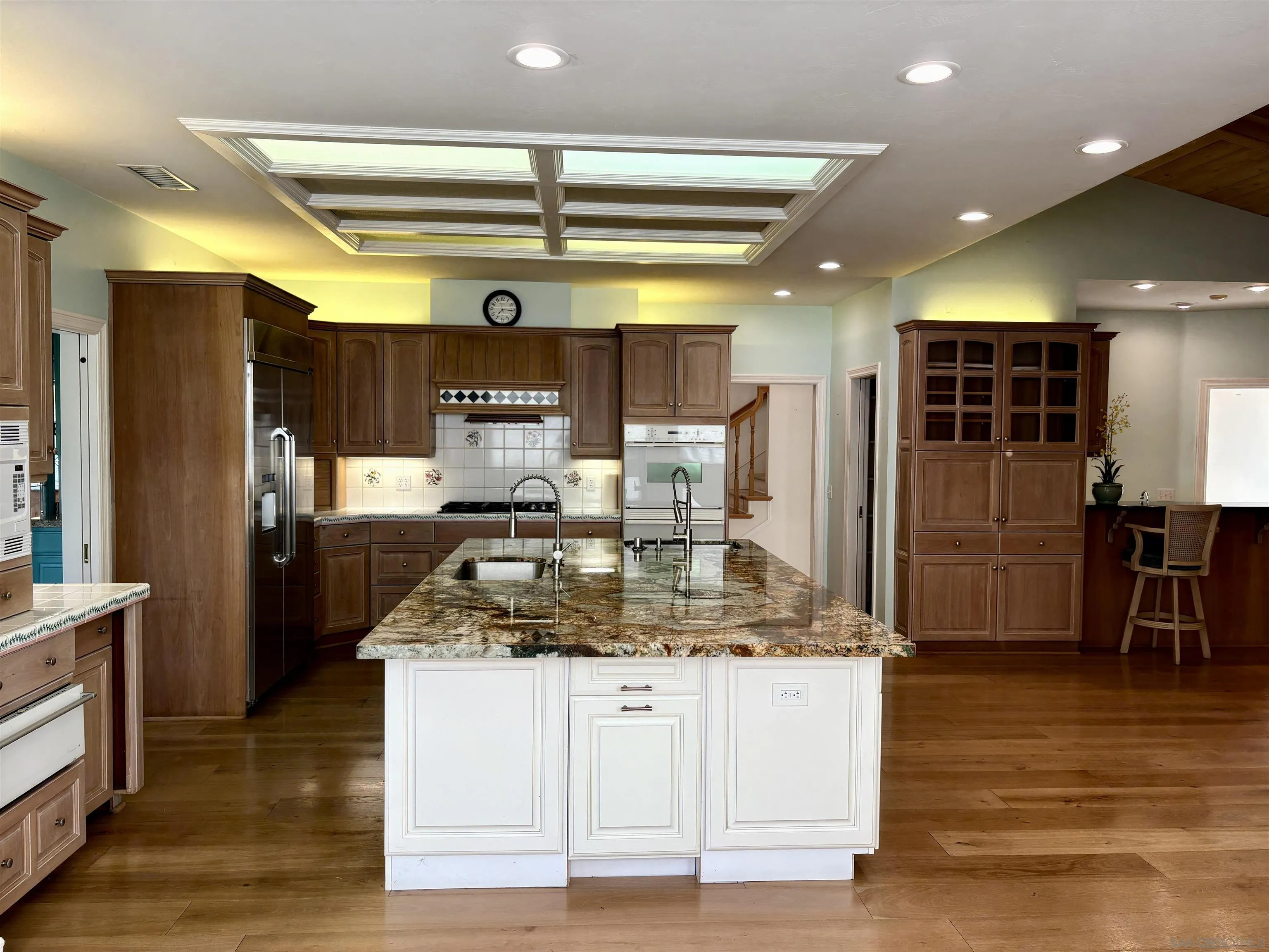 Enjoy year-round golf at the gorgeous Pauma Valley Country Club. This spacious home is set high on the hill with gorgeous views of the course and valley. Wake up to silhouetted mountain sunrises. The 4,314 sf, 2 story home lives like a ranch estate with vaulted ceilings and expanse living spaces. There are 4 en-suite bedrooms with 2 optional rooms/office space. The open concept chef's kitchen has views to the east with a breakfast nook, 2 deep stainless sinks, walk in pantry, double oven, 5 burner gas stove and 9' by 6' granite slab prep area with counter top seating. The large family room has a wet bar, desk area with built in cabinets and a Franklin stove to warm the area for the cooler winter months. The formal dining has a statement chandelier and stained glass doors. Formal living room has surround windows and sliding glass doors, wood floors and 30 foot ceiling. Primary suite has views, patio access, 2 walk in closets with a hidden room. Bathroom has dual sinks, soaking tub and views. Sky lights are in the office, downstairs hallway and stairwell. There are floor to ceiling built-in cabinets in 3 of the en-suite bedrooms, in the wet bar, in the garage and in the laundry room where there is an adjoining cedar lined closet space. The 2 downstairs en suite rooms have sliding glass doors out to the outdoor living spaces. The exterior garden area has been lovingly maintained with 2 Koi ponds complete with water falls and Lilly pads. Owned solar, wine cooler in the 2 car garage plus a separate golf cart garage. Pala and Valley View Casinos located nearby.