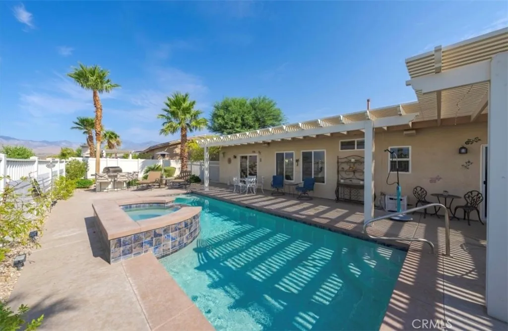 Furnished and all utilities included ! Can be rented 30 days for vacation or mid term rental. Welcome to our oasis in the desert. This home has it all ! Located in the gated community of Mountain View by Mission Lakes. Featuring 3 bed 3 full bathrooms. Heated pool & spa. 2 car garage. RV / Boat parking. Outdoor barbeque area. Patio with misters to stay cool. Amazing location with lots of amenities ! Just a few steps to country club and PGA 4 star golf course. Country club includes restaurant and bar. White House Canyon hiking trail us just across the street. Tennis court, Basketball court & Golf! Who can ask for more ? Just 20 min to Palm Springs. Minutes away from Joshua Tree, Coachella, Shopping, Casino, Outlets, & More ! The property features sweeping views of snow capped San Jacinto & San Gorgonio mountains. Views of the Coachella valley and windmills. Experience jaw dropping sunsets every night while you enjoy the pool and amazing spa underneath the stars and night sky. Outdoor BBQ grill and fully stocked kitchen inside. Spacious bedrooms includes a primary suite with Queen bed large enough to have a living / office area with a sofa, desk and access to the backyard and pool directly from the primary suite! Second bedroom is serene with a queen bed. Last bedroom has 2 double beds. Each bedroom has a full bathroom and all bedrooms are separated for privacy. Large living room is furnished for comfort and has a smart TV. Built in speakers throughout entire house and back yard allows you to play your favorite music and is sure to make your stay fun and entertaining ! Formal