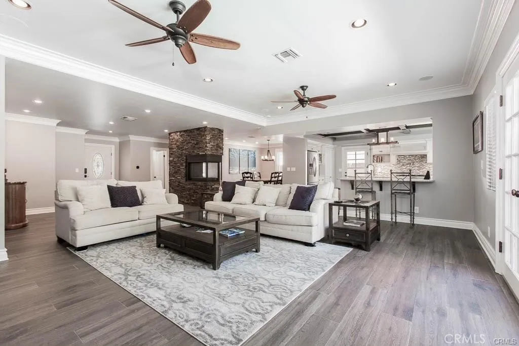 Situated on a quiet, tree-lined street in the desirable North Hills West neighborhood, this stunning single-family home offers 4 bedrooms, 3 bathrooms, and 2,332 square feet of spacious living on a generous 7,594 sq ft lot. Step inside to an inviting open floor plan highlighted by high ceilings, tile flooring, and elegant crown moldings. The stylish, open-concept kitchen flows seamlessly into the living areas. It showcases a beautiful center island, breakfast bar, custom backsplash, quartz countertops, gorgeous cabinetry, and a professional Thermador oven range, ideal for both everyday cooking and entertaining. The expansive living room provides ample space for family and friends to gather and features a striking stone gas fireplace as its focal point. Retreat to the luxurious primary suite, complete with an en suite bath offering a spa tub, a tiled shower, and a generous walk-in closet. The private backyard is your personal oasis, featuring a sparkling saltwater pool refinished with PebbleTec, perfect for unwinding after a long day, letting kids play, or hosting memorable poolside get-togethers. Additional highlights include fully paid solar panels that help reduce electricity costs, a newer roof, new backyard concrete slabs with updated drainage, a 2-car garage with direct access, and much more. Conveniently located near shopping, freeways, and schools, this exceptional home offers comfort, style, and value, truly an outstanding place to call home!