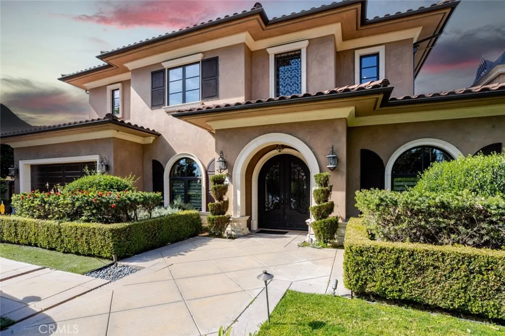Welcome to this stunning custom built residence set on a beautifully landscaped lot in one of Arcadia's most desirable neighborhoods. Offering approximately 5,861 square feet of refined living space, this elegant 4 bedroom, 5 bathroom estate seamlessly blends timeless architectural design with modern luxury and everyday comfort. A grand architectural exterior and gated entry create a striking first impression, leading into an impressive interior defined by soaring ceilings, extensive crown molding, and thoughtfully placed recessed lighting throughout. The formal living room is a true showpiece, featuring a carved stone fireplace, dramatic chandelier, and coffered ceiling that together create a warm yet sophisticated atmosphere ideal for elegant entertaining. The chef's kitchen serves as the heart of the home, showcasing custom cabinetry, an oversized center island, premium appliances, and exquisite stone finishes. Designed for both functionality and style, the kitchen flows effortlessly into the dining and gathering areas, all enhanced by abundant natural light and refined architectural details that elevate daily living and hosting alike. Designed with versatility in mind, the home includes a richly appointed executive office with custom wood paneling and built in shelving, perfect for remote work or study. A dedicated home theater or movie room provides a private cinematic experience, while the temperature controlled wine cellar offers an added layer of luxury for collectors and entertainers. Both upstairs and downstairs bedrooms are generously sized and feature private en