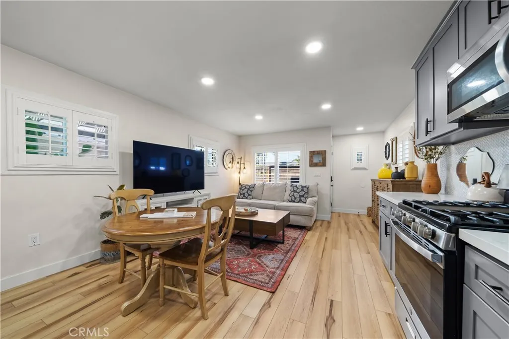 Cozy and beautifully updated, this 2-bedroom, 1-bath home features a fully fenced front courtyard with a covered patio accented by charming pub lightingperfect for relaxing or entertaining. Upon entry, the cozy family room welcomes you with a warm and inviting atmosphere, ideal for everyday living. The remodeled interior showcases new flooring throughout (installed September 2025) and a spacious kitchen featuring gorgeous quartz countertops, a custom backsplash, upgraded cabinetry, and modern stainless steel appliances. The bathroom was recently remodeled in September 2025 and offers a stylish step-in shower with stunning finishes. Additional highlights include elegant plantation shutters, a convenient indoor laundry area, and three storage sheds at the rear of the home providing ample extra storage. Ideal for first-time buyers, downsizers, or anyone seeking a move-in-ready home filled with charm and thoughtful upgrades. Conveniently located just a few miles from Cal State University Long Beach.