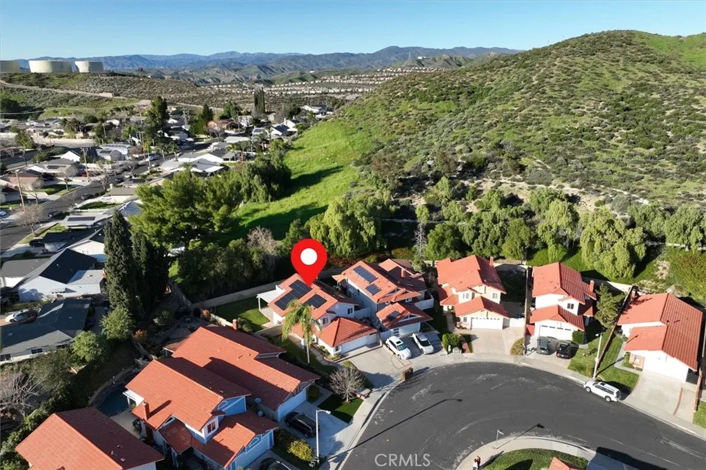 Welcome to this light and bright two-story home, perfectly situated on a quiet street with a large wrap-around yard, no rear neighbors, and serene hillside views. Step inside to the formal living room featuring soaring ceilings, oversized windows, and elegant French doors leading to the backyard, filling the space with natural light. Just off the entry is a versatile downstairs bedroom currently used as a den, complete with custom built-ins, a faux fireplace with heater, and mounted TV. Nearby, the beautifully remodeled downstairs bathroom features a tiled walk-in shower, newer vanity, and mirror. Continue down the hall to the kitchen, which offers granite countertops, a full tile backsplash to the ceiling, stainless steel appliances, recessed lighting, bar seating, and a dining area, with the laundry conveniently tucked away in a nearby closet. The spacious family room showcases a charming brick fireplace and sliding glass doors that lead to the private backyard, creating a cozy yet functional space for everyday living. Step outside to enjoy a large solid covered patio plus an additional slatted patio that allows for extra light, all backing to a gorgeous green hillside offering exceptional privacy and serenity with no rear neighbors. The expansive wrap-around grassy yard provides plenty of space for play, pets, gardening, or entertaining. Upstairs features three additional bedrooms, including a spacious primary suite with high ceilings and a large sliding glass door flanked by satellite windows, opening to an incredible balcony with sweeping hill views. The en-suite bath