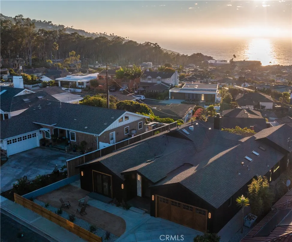 A Contemporary coastal ranch with modern farmhouse elements. The dark vertical siding paired with warm wood garage doors and trim provides a strong contrast and upscale curb appeal; Linear sconces add modernity and make the exterior glow at dusk, emphasizing architectural lines. A new horizontal cedar fence frames the lot, blending with the wood tones of the home. Minimalist landscaping (gravel, succulents, and low-water plants) suits a coastal climate and low-maintenance lifestyle. This coastal luxury retreat in the Hollywood Riviera has been newly reimagined to blend modern design with timeless finishes, offering three bedrooms and three bathrooms across an open floor plan filled with natural light. Sweeping ocean and sunset views define the living experience, with expansive picture windows and sliding glass doors connecting every major space to the outdoors. The rear living room is the architectural highlight, featuring vaulted ceilings with exposed wood beams and custom integrated LED lighting that accentuates the dramatic wood-plank detail overhead. A seamless flow leads into the dining area and designer kitchen, where quartz counters, premium stainless steel appliances, custom cabinetry, and an oversized island create a stylish and functional space for both entertaining and everyday living. The private master suite opens directly to the deck and includes a generous walk-in closet and a spa-style bath with dual vanities, modern tilework, and a walk-in shower. Two additional bedrooms and two full baths provide flexibility for guests, family, or office use. Outdoor livin