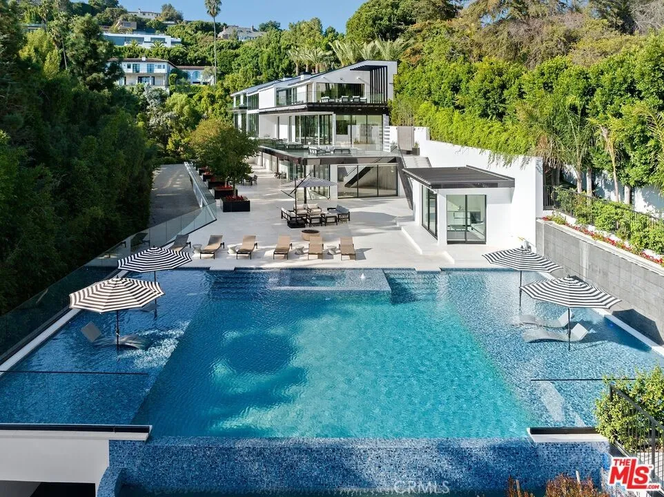A breathtaking expression of sleek, modern architecture and elevated luxury, this newly constructed gated estate rests along Bel Air's prestigious Billionaire's Row. Beyond the impeccably landscaped courtyard is an extraordinary 20,000 square foot interior, masterfully designed to capture sweeping unobstructed views surrounded by some of the world's most valuable real estate. Created for grand scale entertaining, the seamless multi-level floor plan reveals expansive living spaces defined by dramatic linear fireplaces, soaring ceilings, and walls of automated glass that effortlessly merge indoor and outdoor living. Floor to ceiling windows flood the home with natural light while framing spectacular vistas; by evening, designer pendants, contemporary chandeliers, and refined recessed lighting create an intimate, sophisticated ambiance. All three levels are accessed by a statement staircase or commercial grade elevator and are appointed with premier amenities. Five sumptuous bedroom suites each with bespoke finishes, spa-inspired baths, generous walk-in closets, and private balconies, offer exceptional comfort. The primary suite is a retreat unto itself, showcasing vaulted ceilings, an elegant fireplace and expansive wraparound balcony, dual boutique style closets, and two lavish spa baths featuring oversized waterfall showers and a sculptural soaking tub. Additional highlights include a state-of-the art theater, fully equipped fitness center, wet and dry saunas, and a private salon/spa room. Outdoors, a striking infinity edge pool commands dazzling city views. A truly unique