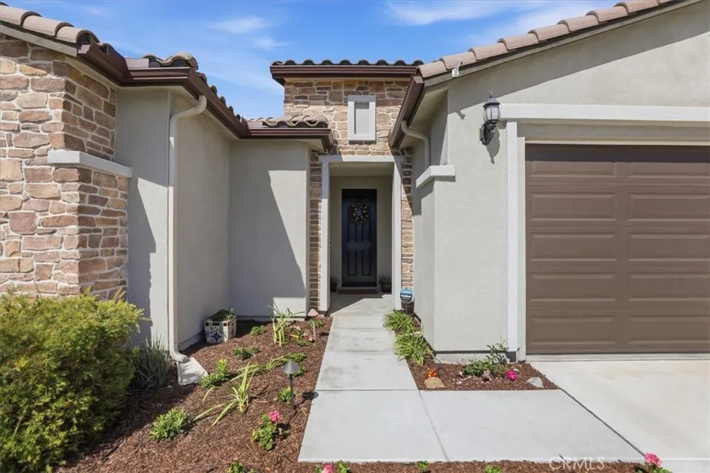 Welcome to this beautifully upgraded single-story home located in a sought-after newer gated community of Highland Grove. Less than 3 years old, Offering 2,550 square feet of thoughtfully designed living space, this spacious residence features four bedrooms and three full bathrooms, perfectly blending comfort and functionality. The open and inviting floor plan includes a formal living room and a formal dining room, ideal for entertaining guests or hosting special gatherings. At the heart of the home is a stunning upgraded kitchen showcasing elegant quartz countertops and backsplash, premium stainless steel KitchenAid appliances, and abundant cabinetry, pendant lighting, porcelain farm sink, under cabinet accent lights and pantrydesigned to impress even the most discerning chef. The living room is perfect place to unwind, very spacious and equipped with 5.1 speaker system. The private primary suite is a true retreat, featuring a spa-like bathroom with luxurious finishes, dual vanities, frameless shower, soaking tub and a spacious walk-in closet complete with custom built-ins for optimal organization. Additional highlights include a three-car tandem garage offering ample parking and storage space, along with modern upgrades throughout the home that enhance both style and convenience. Other amenities include ceiling fans, walk-in closets in secondary bedrooms, tech center currently used as a coffee bar, plantation shutters, drapes, 9 ft ceilings, integrated smart home technology and energy efficient designs to include a solar system with a battery, tankless water heater, three