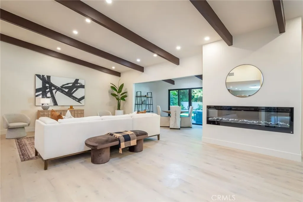 A next gen Dubois - modernized single-story blending iconic mid-century architecture with refined contemporary style awaits Beyond the unique black onyx stone accented drive and through the textured white oak doors, nearly 3,500 square feet of clean lines, sculpted finishes, and soaring beamed ceilings unfold. This four-bedroom, four and a half bath home showcases decor offering neutral kitchen with Viking range, Cincinnati Oak cabinetry, and striking single-slab Taj Mahal Quartzite center islandsure to be the heart and focal gathering point for good food and conversation. The open-design living room flows into the dining room, which features a rich custom slatted statement wall highlighted by ambient impact lighting. Boldly designed to blend depth and contemporary class, this space is further enhanced by the custom-built wine bar. A great entertaining room that expands to glass doors leading to the lush rear yard, creating a true California indoor-outdoor living experience. The greenery with fruit trees, an in-ground PebbleTec jacuzzi, grass to play and a BBQ kitchen center creates your own entertainment center, or personal oasis. Each bedroom is a retreat with ensuite spa-inspired shower or bath designed with Zellige tile, upscale fixtures, and stylish finishes. The primary suite offers an added sitting area and a resort-style primary bath featuring dual sinks, a shower room with oversized soaking tub, and glass-enclosed stone shower with dual shower heads for the ultimate relaxation experience. Every detail has been carefully considered to honor the homes mid-century roo
