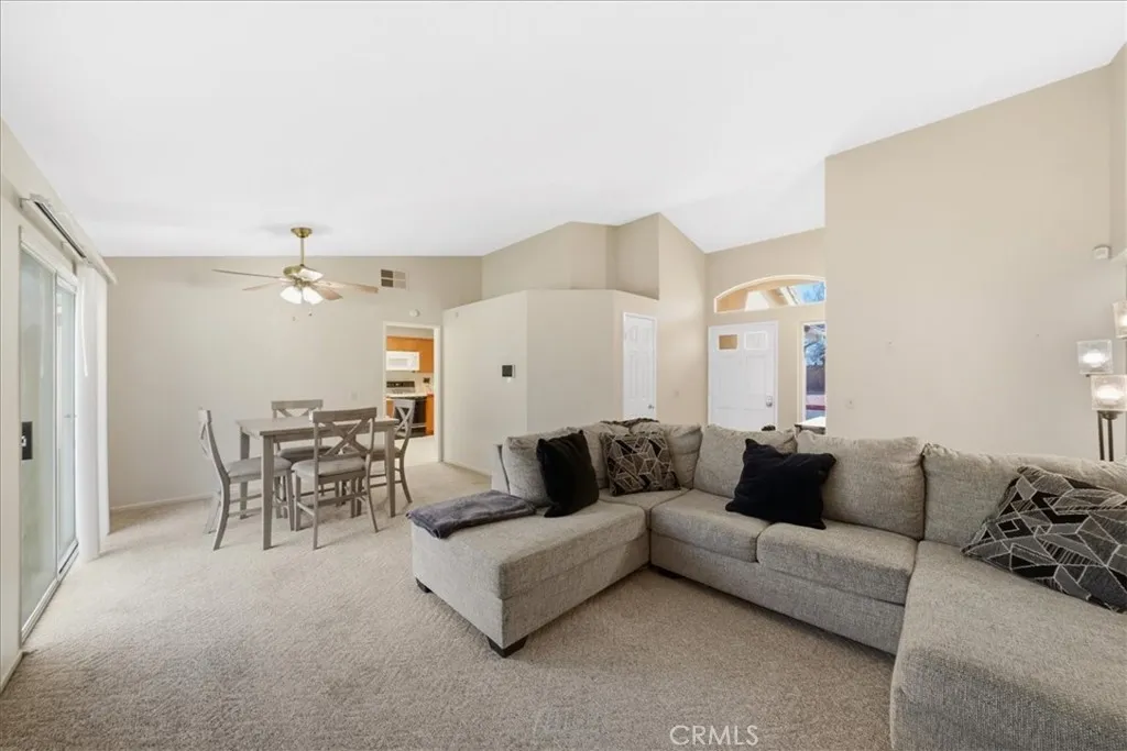 Welcome to 717 Balsam Way, a beautifully maintained single-story home nestled in the gated Laurel Park community in Hemetan all-ages neighborhood offering resort-style amenities and convenient access to shopping, recreation, and entertainment. This thoughtfully designed home features 2 bedrooms and 2 bathrooms with 1,217 square feet of living space, including a spacious primary suite and a private junior suite, making it ideal for guests, extended family, or a home office. The home sits on a 4,792 square foot lot with attractive curb appeal highlighted by a wide driveway, mature shade tree, and easy-care landscaping. Inside, the open floor plan creates a bright and welcoming atmosphere. The entry opens to a light-filled family room with soaring ceilings and a tile fireplace with wood mantle. The living space flows seamlessly into the dining area with sliding glass doors leading to the backyard. The eat-in kitchen offers ample cabinetry, tile countertops, and a water filtration system under the sink. The spacious primary suite features vaulted ceilings, an upgraded ceiling fan, and a walk-in closet. The ensuite bathroom includes dual sinks, a soaking tub, and a separate walk-in shower. Down the hall is a generously sized junior suite with its own walk-in closet. Additional interior highlights include designer two-tone paint, Berber carpet flooring, custom window treatments, and an indoor laundry room with built-in cabinetry. Step outside to a spacious backyard with mature fruit trees, offering a wonderful opportunity to design your own outdoor retreat. Laurel Park residents